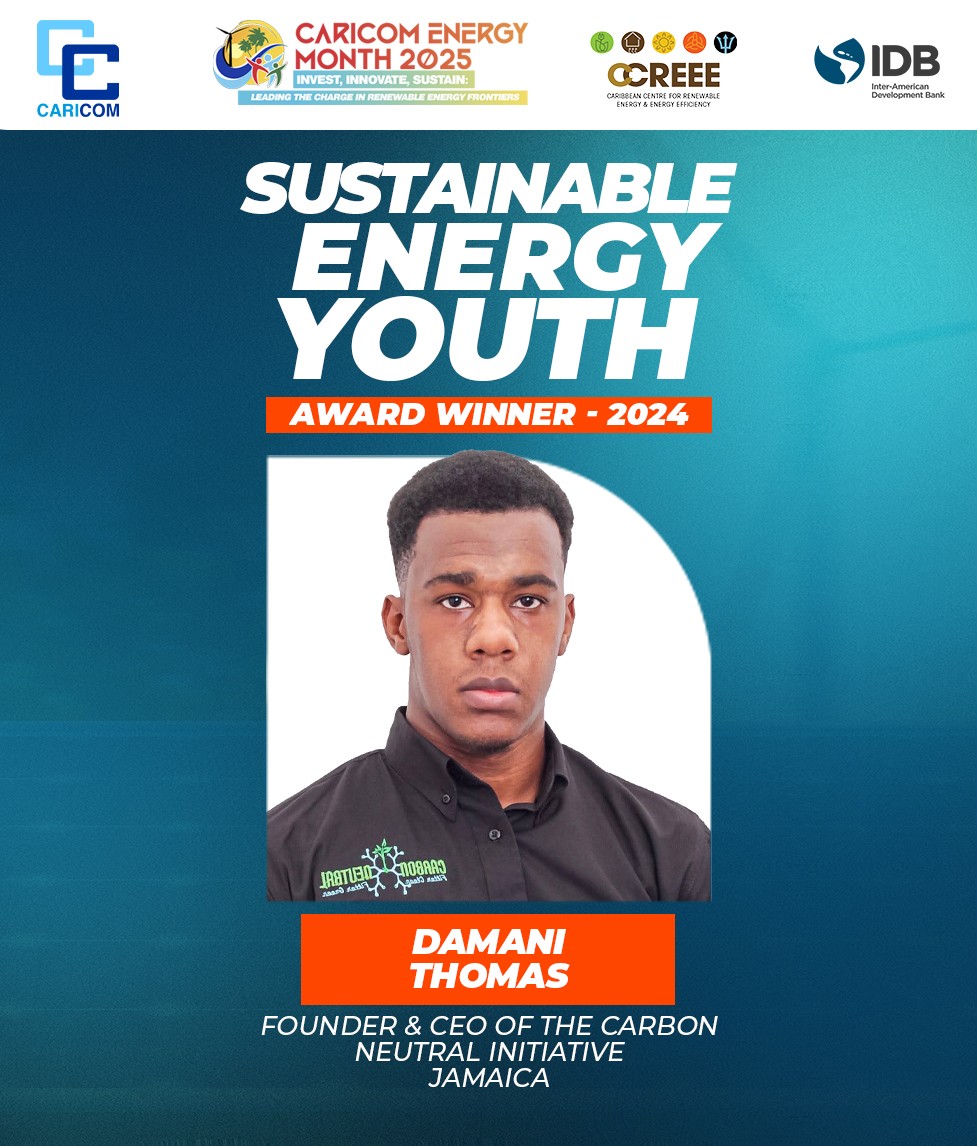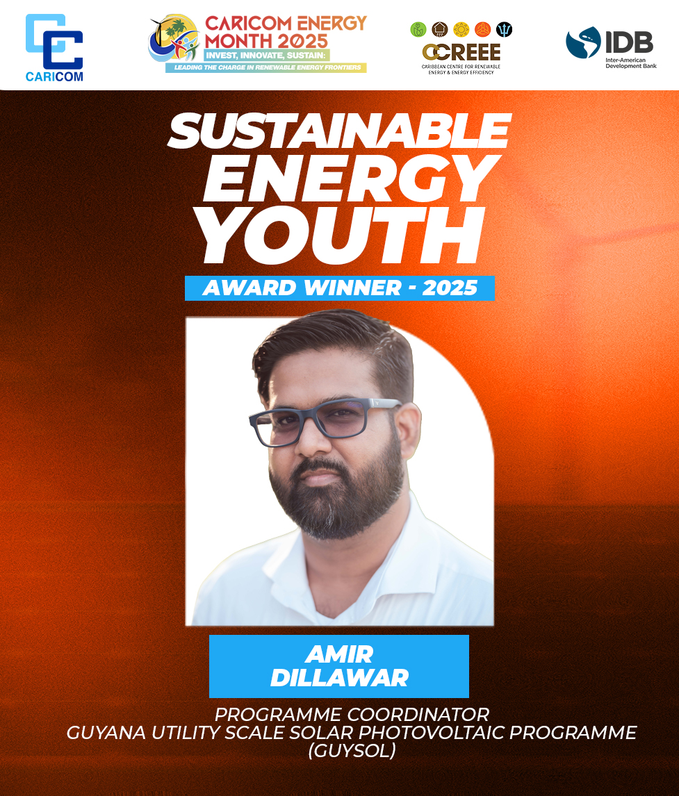 Amir Dillawar, Programme Coordinator, Guyana Utility Scale Solar Photovoltaic Programme (GUYSOL), and Damani Thomas, Founder and CEO of the Carbon Neutral Initiative, Jamaica, are the honourees for the SEYA for 2025 and 2024, respectively.