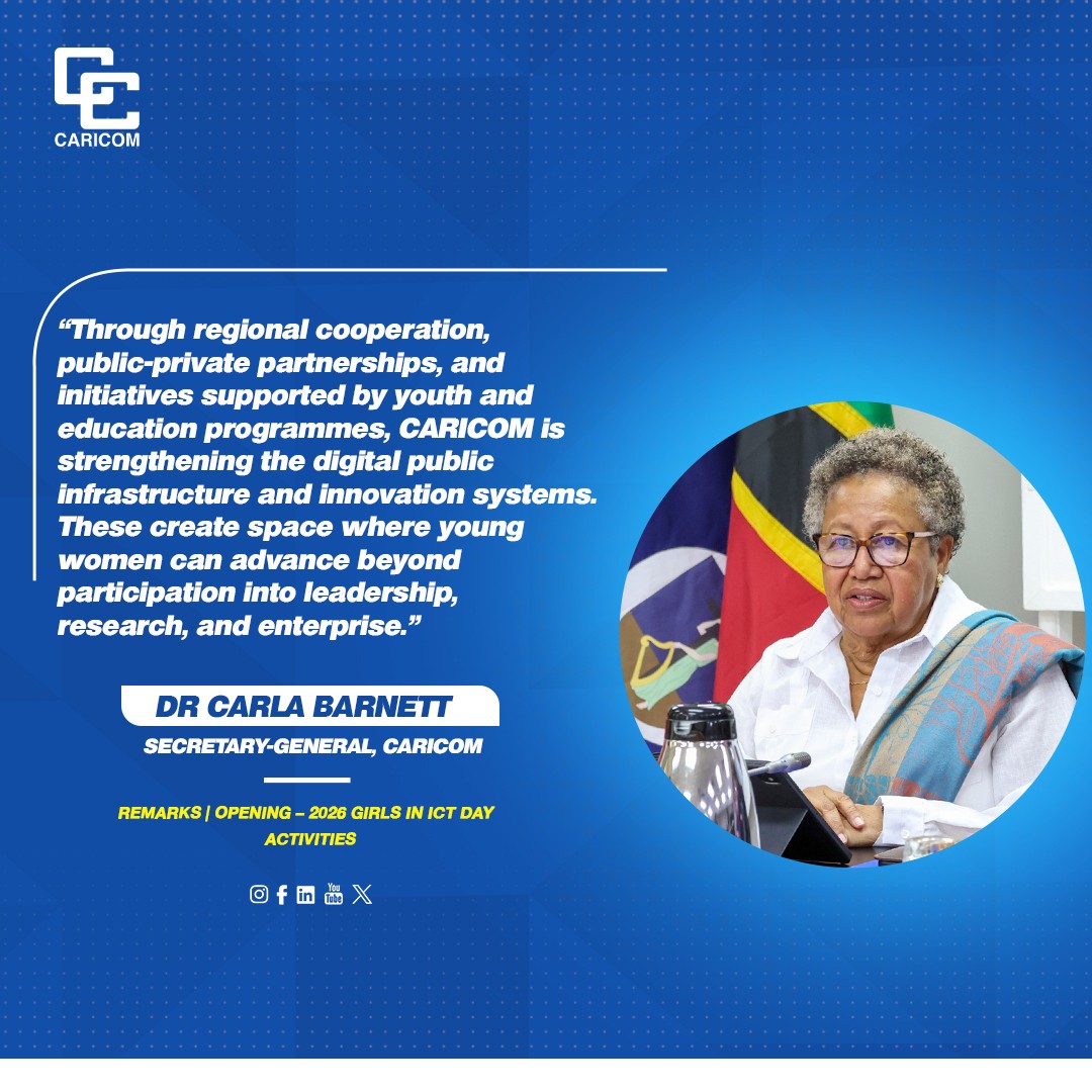 Dr. Carla Barnett, CARICOM Secretary-General, used elements of the regional theme of Girls In ICT Day 2026 – empower, educate, and elevate – to define what Member States must continue to do to build a Caribbean Community that is being rapidly reshaped by technology.