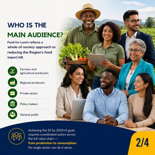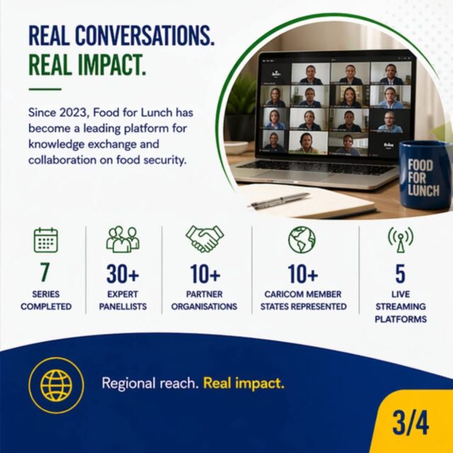 Food for Lunch is one of the activities organised by the Secretariat and its partners as part of the 25 by 2025+5 Initiative. As a knowledge-sharing, collaborative exchange, the webinar series places the spotlight on sustainable agriculture and food and nutrition security in CARICOM.