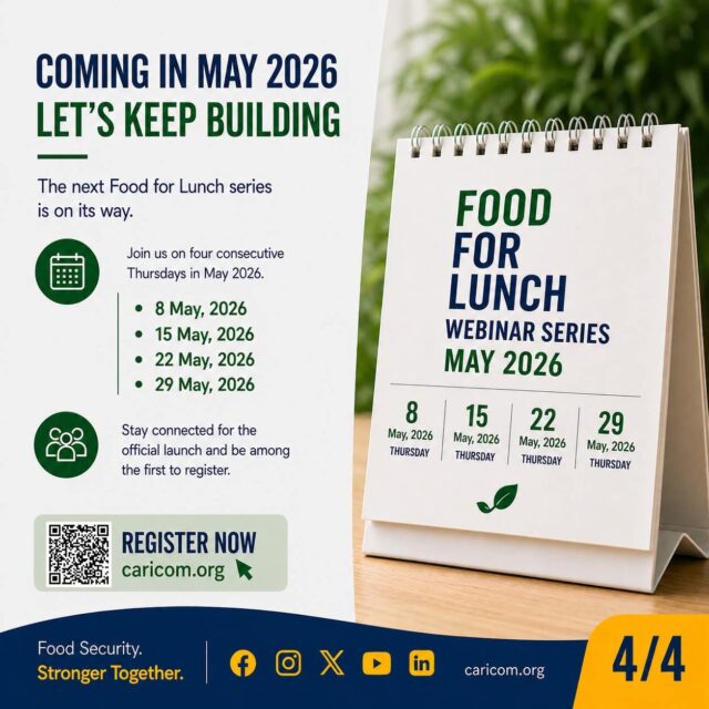 The Secretariat’s Food for Lunch webinar series returns in May with a focus on disaster preparedness. This round of midday discussions will begin on Friday, 8 May, under the theme ‘Be Ready for the Storm: Caribbean Hurricane Preparedness 2026’.