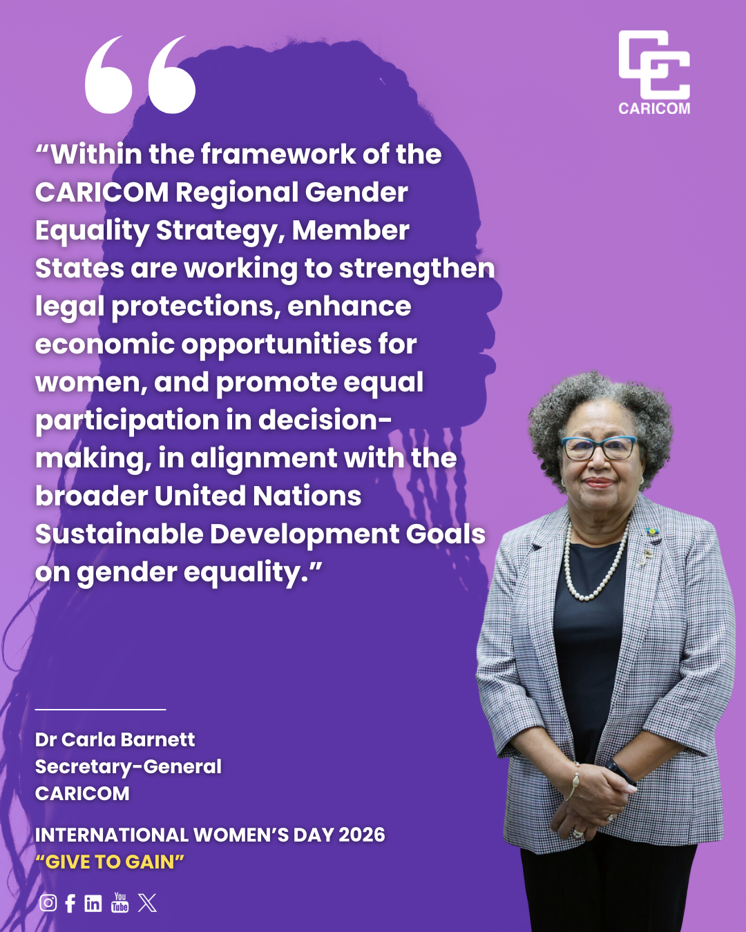On International Women’s Day, the Caribbean Community (CARICOM) celebrates the contributions and achievements of women and girls and renews its commitment to advancing gender equality across our Region, and the world. The theme for this year’s observance, “Give to Gain”, reminds us that when we invest in the well-being and development of women and girls, societies reap profound social and economic benefits.