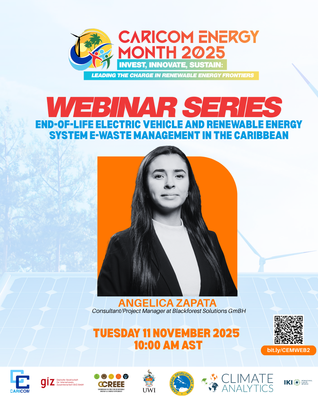 Join us on Tuesday, 11 November 2025 at 10:00 am AST for the second session in the CARICOM Energy Month 2025 Webinar Series. This webinar will focus on “End-of-Life Electric Vehicle and Renewable Energy System E-Waste Management in the Caribbean” and will be presented by Angelica Zapata, Consultant and Project Manager at Blackforest Solutions GmbH.